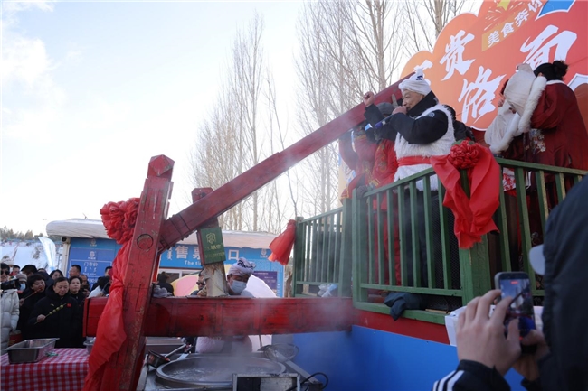 开幕式现场亮点纷呈,热力十足。热场节目《福到好运来》与体彩红包雨点燃全场气氛;滑雪特技微短剧《塞外和鸣》展现了冰雪运动的速度与激情;鼓舞表演《万马奔腾越雪原》奏响草原豪情;歌舞秀《冰雪新天地》绽放冬日浪漫。活动现场还深度融合了丰富的消费与互动体验:“九转烟火・冰雪饭局”美食区香气四溢,开锅饺子宴中藏有惊喜大奖;千人共享的富贵饸饹面开锅仪式热闹温暖;特色运菜队伍沿途互动,派送新鲜果蔬;“九大福星”NPC引领游客进行趣味打卡挑战,赢取各类奖励。晚间,“冰雪燃情”环节的烟花瀑布与篝火晚会将热烈氛围推向高潮。